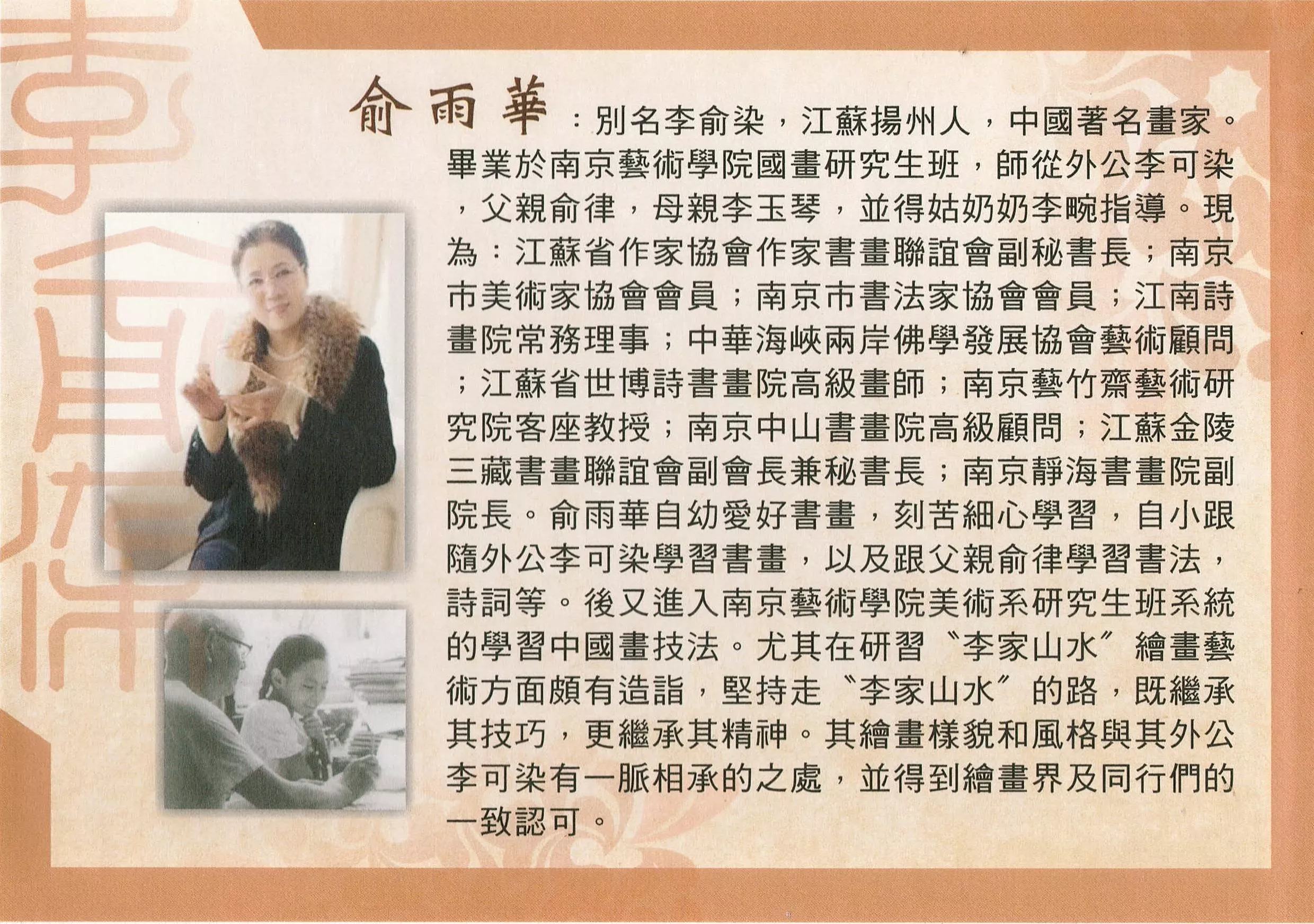 李俞染,本名俞雨華,出生於江蘇。她出身於聲名顯赫的藝術世家,身為國畫宗師李可染的外孫女,她自幼便耳濡目染, 7 歲起便隨外公李可染研墨展紙,貼身學習長達二十餘年,深得「李家山水」的真傳。