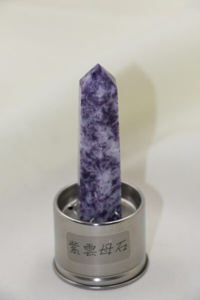 選用天然紫雲母能量柱,晶體呈現細緻紫色光澤,