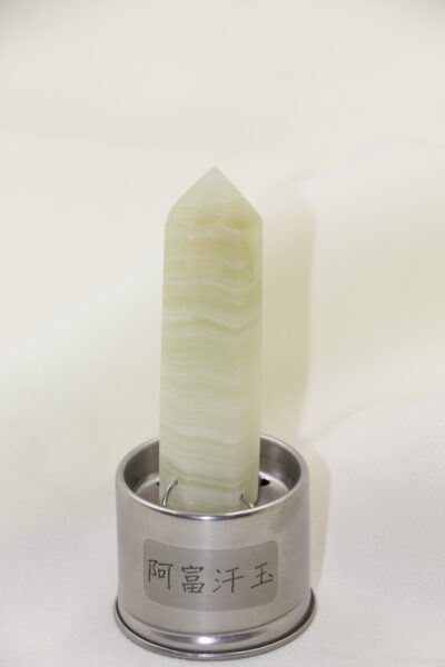 選用天然阿富汗玉能量柱,晶體呈現柔和綠色光澤,